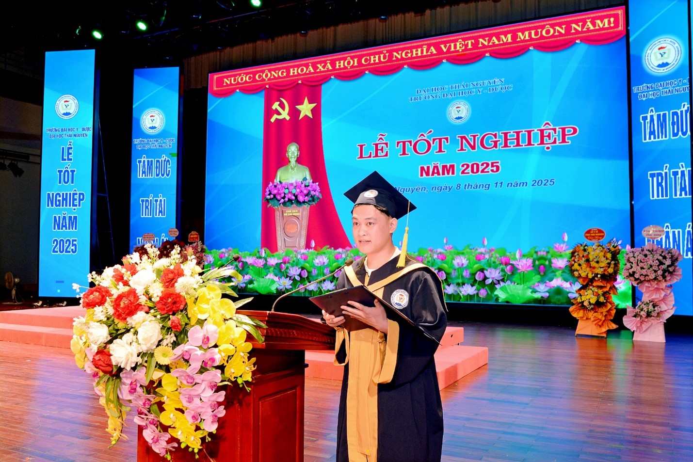 Thay mặt cho toàn thể sinh viên tốt nghiệp, tân bác sĩ Vũ Ngọc Linh Chi phát biểu gửi lời tri ân sâu sắc tới Ban Giám hiệu, quý thầy cô và gia đình: Chúng em xin được gửi lời tri ân sâu sắc nhất tới Nhà trường và thầy cô đã tận tâm dìu dắt, truyền đạt kiến thức và thắp sáng ngọn lửa nghề trong mỗi chúng em. Dù mai này đi khắp mọi miền, chúng em vẫn mãi tự hào là sinh viên Trường Đại học Y - Dược, Đại học Thái Nguyên.